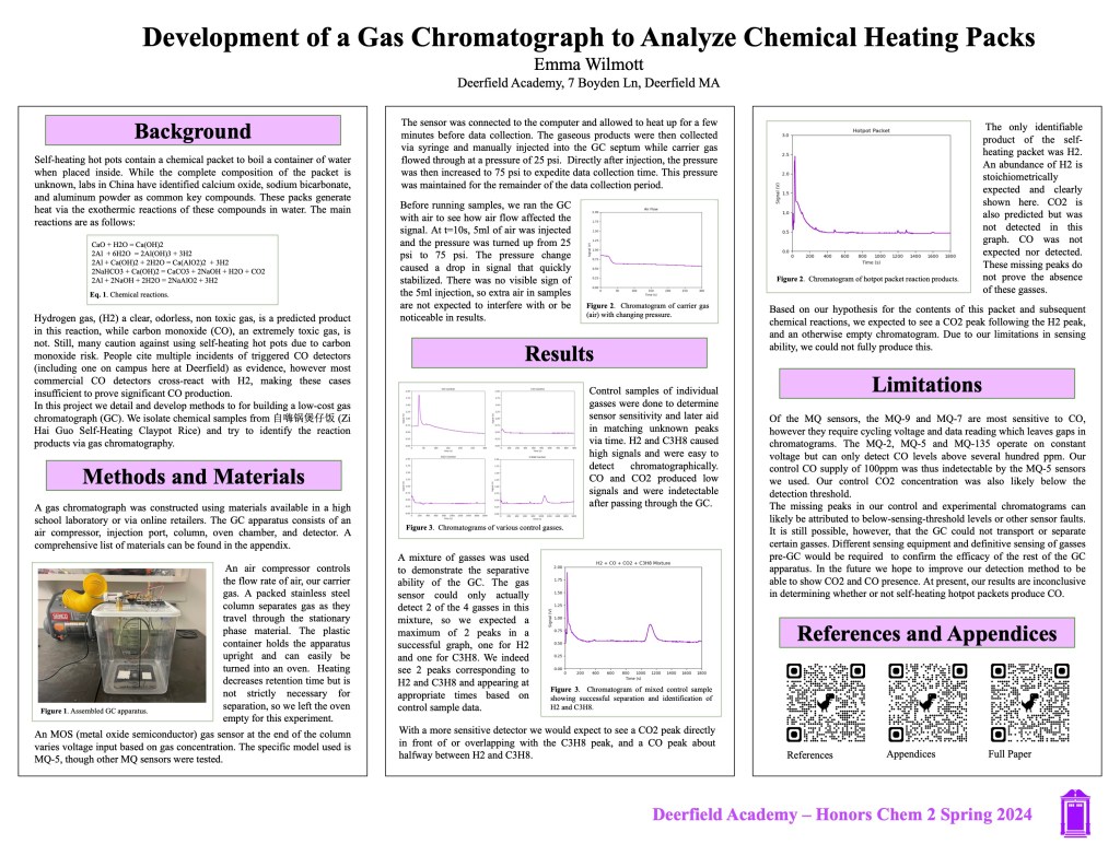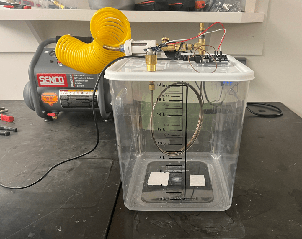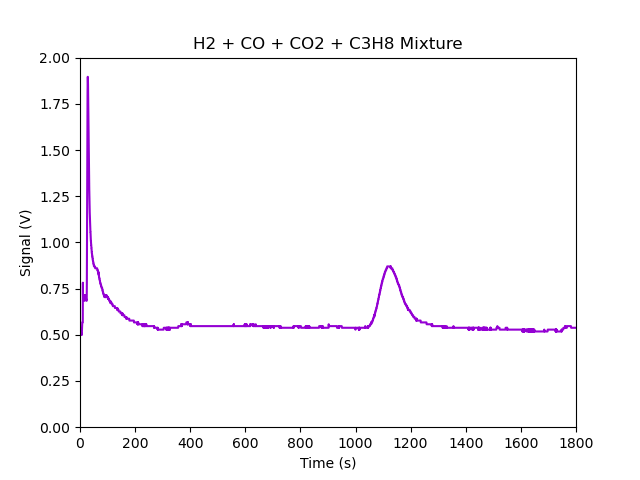 the chromatograph was initially built to try to separate hydrogen gas and carbon monoxide, as well as various other unknown compounds. we tested individual control samples and made a mixed control sample, but the concentration of co and co2 in the samples ended up being below the detection threshold of the sensors. so we focused on visualizing the detectable gasses h2 and c3h8, which separated extremely clearly.